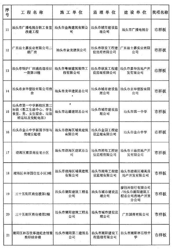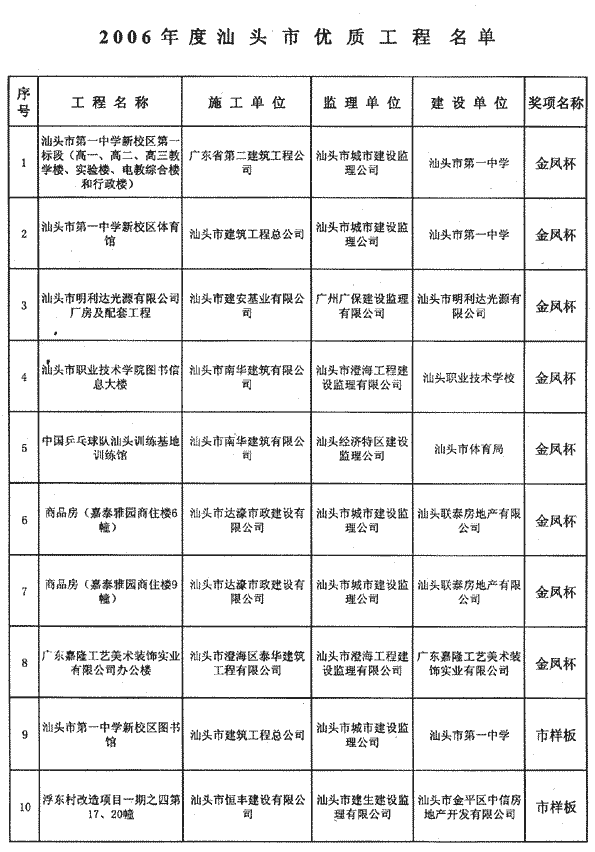 2006年度汕頭市優(yōu)質(zhì)工程評選結(jié)果公示汕府建公示[2007]2號