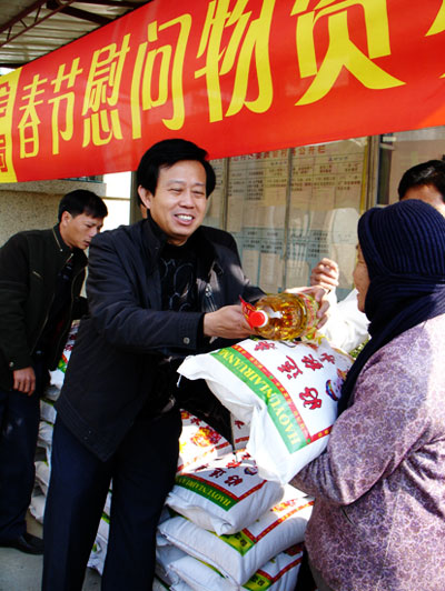 市建設(shè)局局長(zhǎng)王德聲向貧困村民發(fā)放春節(jié)慰問(wèn)物資