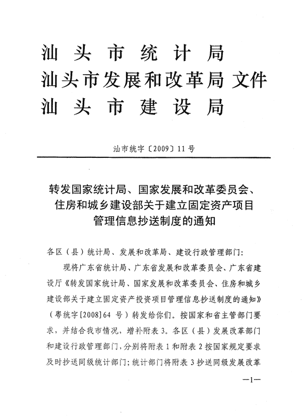 轉(zhuǎn)發(fā)國家統(tǒng)計局、國家發(fā)展和改革委員會、住房和城鄉(xiāng)建設(shè)部關(guān)于建立固定資產(chǎn)項目管理信息抄送制度的通知