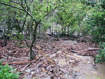 (洪水漫堤,淹過(guò)河邊的樹(shù)林)