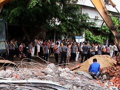 由于該“伯公廟”理事組人員無視法規(guī),占用新河溝及溝邊綠化帶違法擴(kuò)建,影響了城市市容和新河溝排水安全,試圖搶建造成違法既成事實(shí),影響極壞。龍湖區(qū)決定組織相關(guān)部門、單位對該處違法設(shè)施予以強(qiáng)制拆除,區(qū)專門成立了拆違工作領(lǐng)導(dǎo)小組,具體負(fù)責(zé)此次拆違工作的組織實(shí)施。由區(qū)政府楊時(shí)亮副區(qū)長任組長,區(qū)建設(shè)局張義良局長、市市政設(shè)施處郭郁林主任、珠池街道辦事處鄒漢湖主任任副組長。區(qū)建設(shè)局、市市政設(shè)施處、珠池街道辦事處、丹華社區(qū)居委會及珠池派出所有關(guān)領(lǐng)導(dǎo)為成員。參加此次強(qiáng)制拆違行動(dòng)共98人,其中區(qū)城管執(zhí)法局48人、市市政設(shè)施處10人、珠池街道及丹華社區(qū)居委會15人、其他工作人員25人。行動(dòng)前,拆違工作領(lǐng)導(dǎo)小組就拆違任務(wù)、職責(zé)分工、拆違時(shí)間、人員安排、雇傭設(shè)備等事項(xiàng)精心部署,充分考慮安全保障、應(yīng)急預(yù)案。24日上午8時(shí),當(dāng)拆違隊(duì)伍到達(dá)現(xiàn)場時(shí),發(fā)現(xiàn)丹陽 “伯公廟”理事組人員發(fā)動(dòng)一班老年人占據(jù)施工現(xiàn)場,試圖阻止拆違工作。拆違隊(duì)伍迅速各就各位,耐心勸說該群老年人離開施工現(xiàn)場,并拉起人墻警戒。拆違隊(duì)伍克服暴雨淋、烈日曬,一直堅(jiān)持施工,隨著挖掘機(jī)、破碎機(jī)的轟鳴聲,現(xiàn)場違法搭建的磚墻、地面鋪設(shè)的鐵鋼板、鋼筋以及新河溝里的鋼管鋼筋、水泥樁、水泥墩被一一拆除、拔起,各種拆除物被清理干凈,綠化帶又重新種上了樹木。市城管執(zhí)法局也派員現(xiàn)場督導(dǎo),并聯(lián)系汕頭電視臺“今日視線”欄目現(xiàn)場采訪報(bào)道。